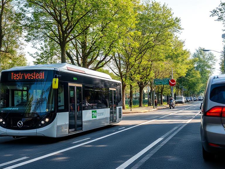 Alt text suggestion : Piste cyclable et bus électriques dans une ville française